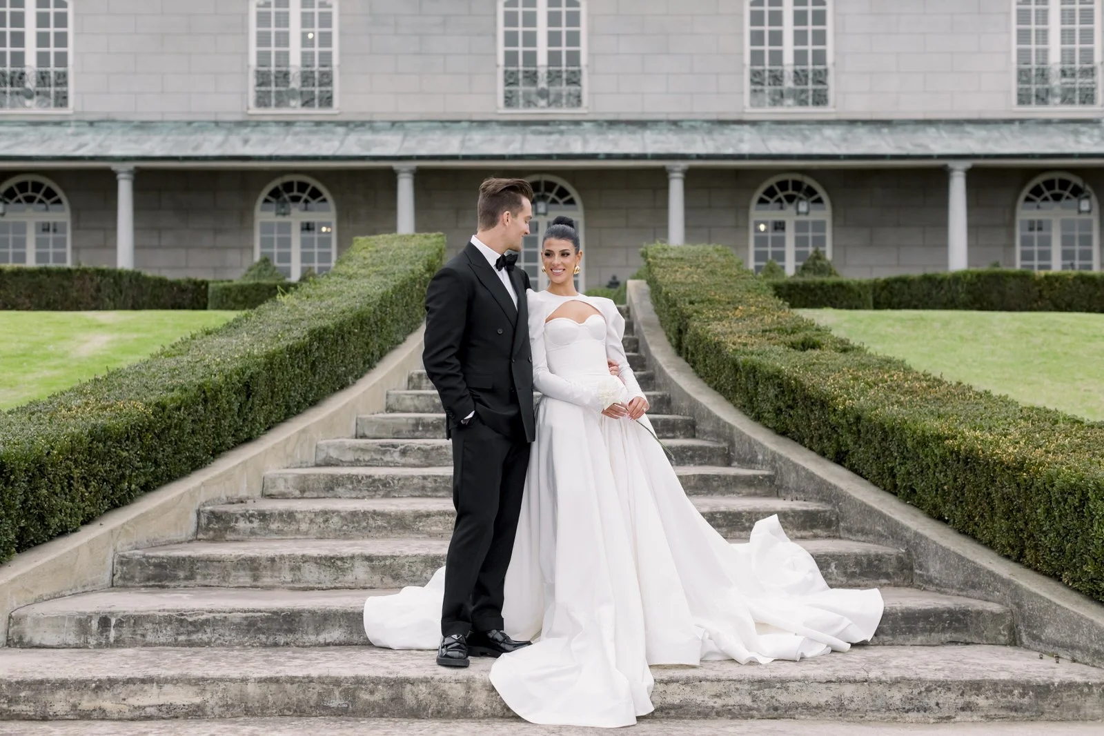 The bride, Stephanie, wore a couture Oglia Loro gown, luxurious and decadent in detail and dramatic in structure. Imbued with romance with a mood of classicism, this French-style mansion wedding was filled with single stem rose and natural toned polished tablescapes.